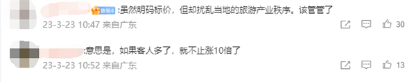 有网友表示,“意思是,如果客人多了,就不止涨10倍了”“希望此类问题整顿下。”当然,也有人给出不同观点:“觉得贵不去就是了,明码标价,人家自己的民宿,愿意怎么定价就怎么定价。不会错峰旅游吗,偏赶人多的时候去,玩也玩不好,还什么都贵,何必呢”。