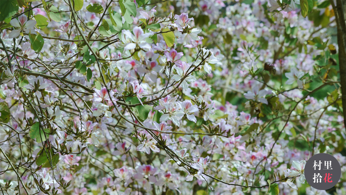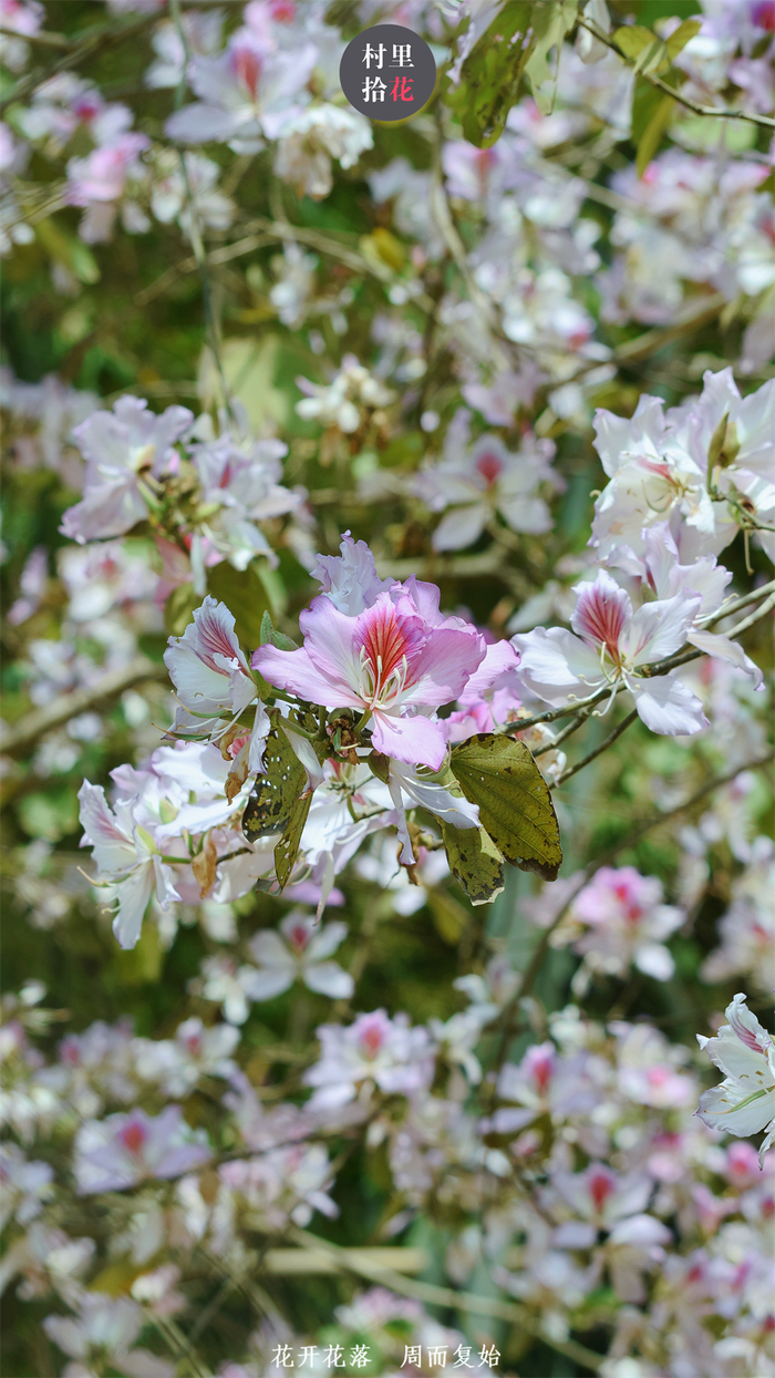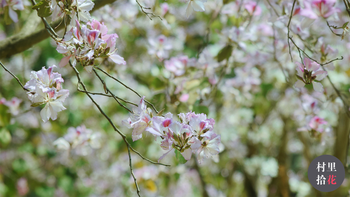 洋紫荆细长的枝条上,有花无叶。粉嫩的花朵密密麻麻,层层叠叠,洋洋洒洒,风吹不止,花开无数,处处可见其绚烂的身姿。