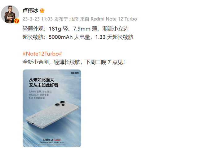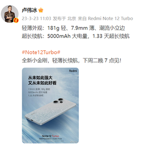今天,小米集团合伙人、总裁,国际部总裁,Redmi 品牌总经理卢伟冰更新微博,预热 Redmi Note 12 Turbo。其表示这款手机将内置一块 5000mAh 电池,最长续航时间可达 1.33 天。此外,新机整机重量将轻至 181g,厚度约为 7.9mm。