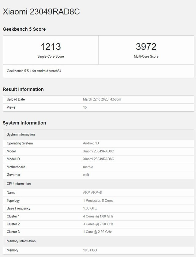 Redmi官方宣布,Redmi Note 12 Turbo将于3月28日晚7点发布,搭载骁龙7+ Gen 2芯片,预装安卓13系统。该手机已现身跑分网站,单核得分1213,多核得分3972,内置12GB内存。现在这款手机(型号 Xiaomi 23049RAD8C)已经现身跑分网站,Geekbench 5 单核分数 1213,多核分数达 3972。该清单还确认该手机将搭载Android 13,拥有 12GB 内存版本。