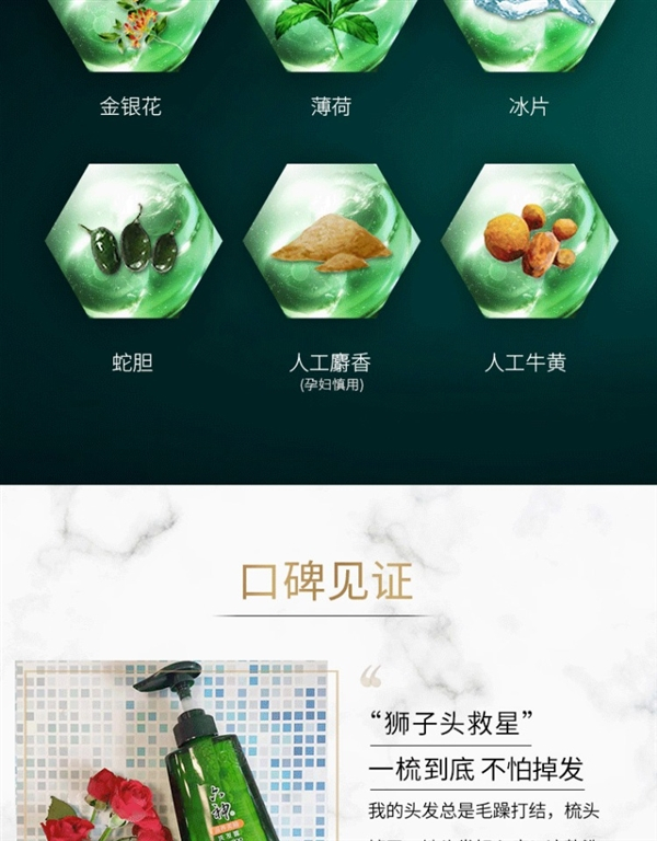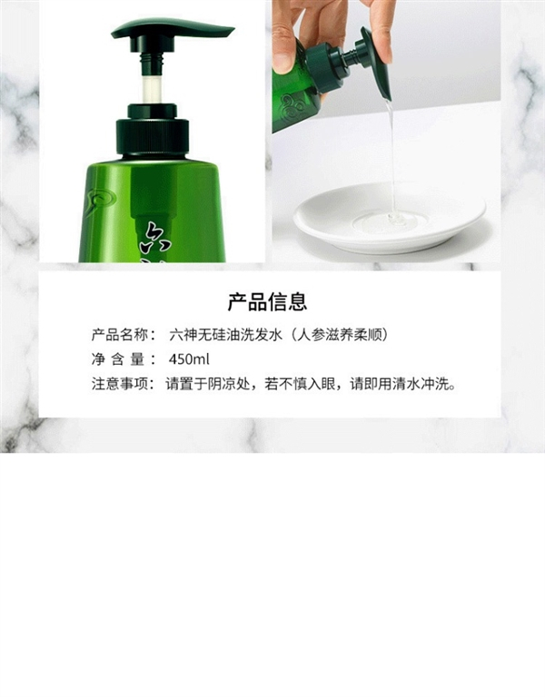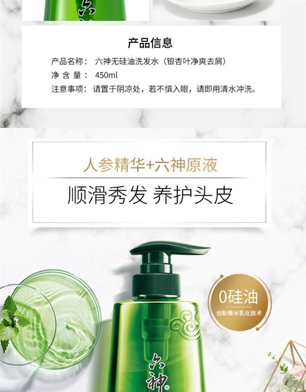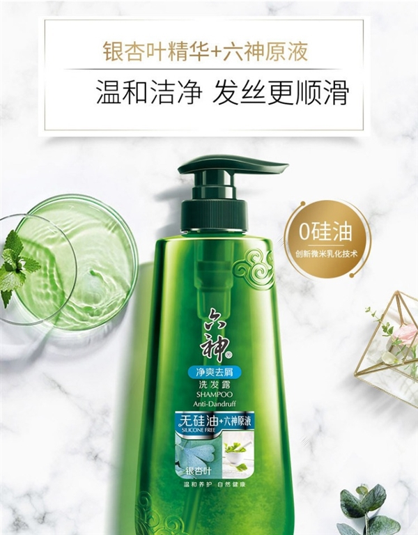 采用0硅油“微米乳化技术”用更亲肤的油脂代替硅油,添加六神原液(金银花、薄荷、冰片、蛇胆、人工麝香、人工牛黄)。