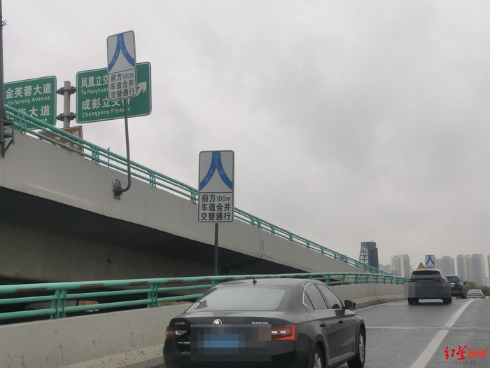 上午10点,红星新闻记者来到三环路交大立交出城右转匝道与进城左转匝道合流处,两条匝道沿途设置了多面交通提示牌,写着“车道合并”“交替通行”等提示。在匝道由2条车道合并为1条车道的位置设置“依次交替通行区”,左侧车道定义为1车道、右侧车道定义为2车道,车道内施划3米长的矩形框作为车辆“依次交替通行让行区”。