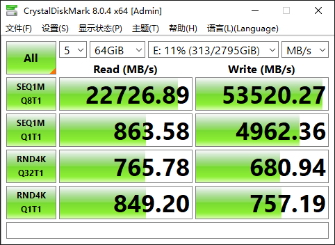 为了使测试数据尽可能准确,我们进行了 5 次测试,测试的数据包大小为 64GiB。测试结果显示:该硬盘的顺序读取速度为 22726MB/s,顺序写入速度为 53520 MB/s。
