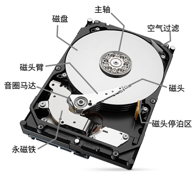 这是一张机械硬盘的内部结构图,当我们需要读写数据的时候,磁盘会在电机的驱动下高速旋转,磁头则会在磁盘上读写相应的数据。这时候如果机械硬盘受到撞击,那么磁头很容易在冲击的影响下把磁盘划伤,从而造成硬盘的损坏。如果硬盘在非读写状态下受到撞击,情况会好一些。因为在非读写状态下,磁头位于磁头停泊区,与磁盘还是有一定距离的。所以这时候硬盘受到一定的撞击产生晃动,往往不会造成磁盘损坏。当然,要是撞得太狠该坏还是会坏。