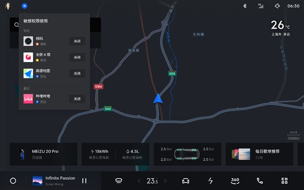 具体来看,魅族FlymeAuto车机系统支持敏感行为全程高亮提醒,敏感权限调用即可追溯,应用权限随时一键关闭等,一同曝光的车机界面上,还拥有哔哩哔哩、高德地图、全民K歌等应用,也就是说其将支持不少第三方应用。