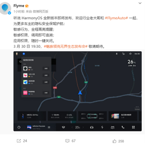 3月23日,魅族Flyme官方发布消息称:“听说HarmonyOS全新版本即将发布,欢迎行业老大哥和FlymeAuto一起,为更多车主的隐私安全保驾护航。