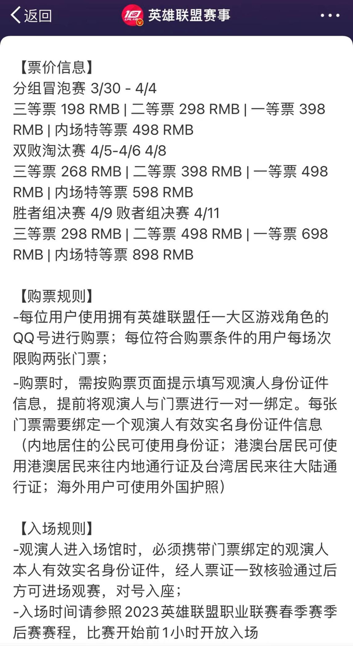 3月23日下午,英雄联盟赛事官方公布了2023年春季赛季后赛赛程及开票信息,同时公布了比赛的票价,其中胜者组决赛的票价区间从298元到898元。不少网友吐槽票价偏贵,纷纷表示“你怎么不去抢?”官方的定价也从侧面说明了线下赛事正在复苏。