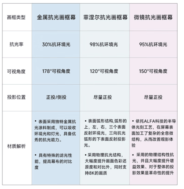 目前抗光幕主要有三种类型,高端的金属抗光幕,菲涅尔抗光幕以及微镜抗光幕。三种幕布根据抗光率的不同,可视角度不同。同时只有金属幕布是适合激光电视的,而后面两种可以用于正投的投影机。