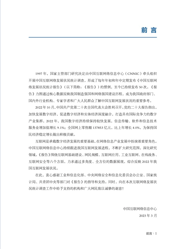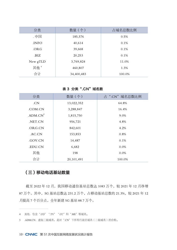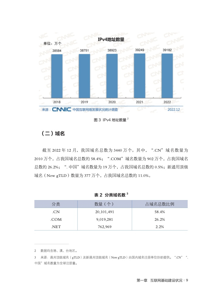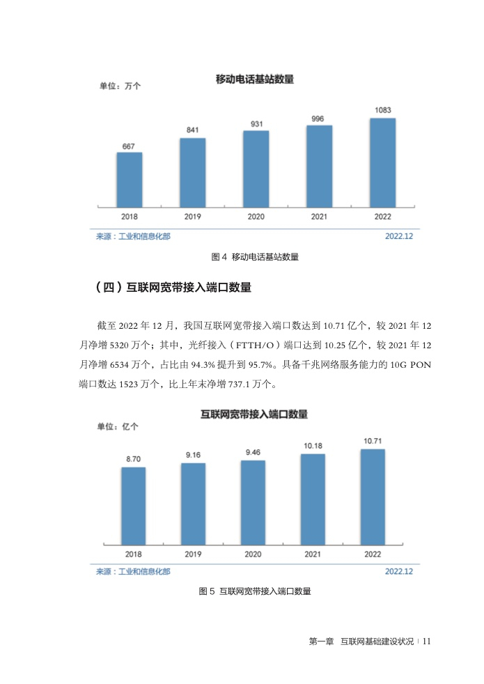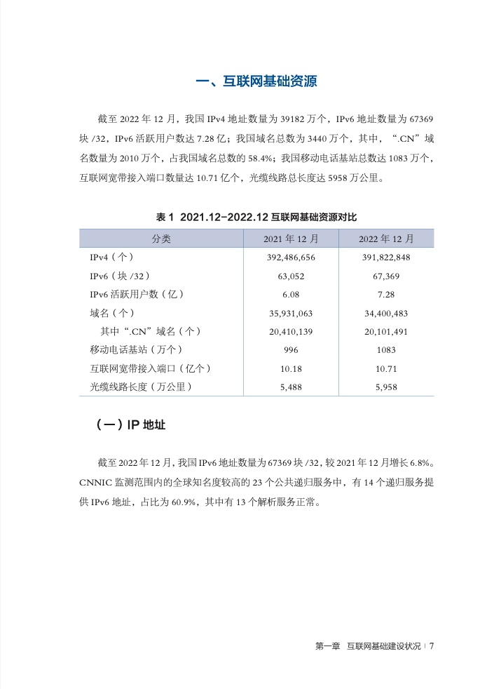 2022 年,我国互联网基础资源持续增长,IPv6 地址数量达 67369 块 / 32,同比增长 6.8%,有力支撑下一代互联网规模部署。我国光缆线路总长度达到 5958 万公里,比上年末净增 477 万公里,网络运力不断增强;我国千兆光网已经具备覆盖超过 5 亿户家庭的能力,5G 基站数量达 231 万个。千兆城市平均城市家庭千兆光纤网络覆盖率超过 100%,实现城市家庭千兆光网全覆盖。