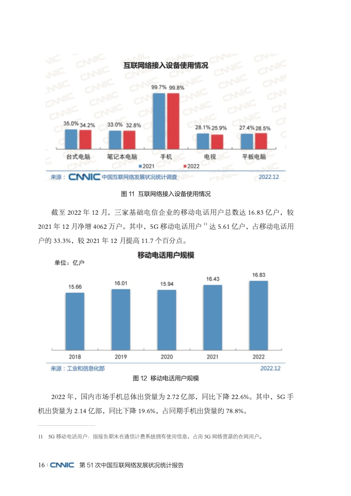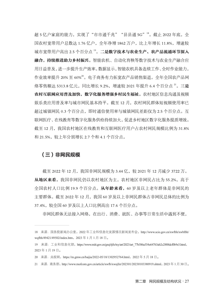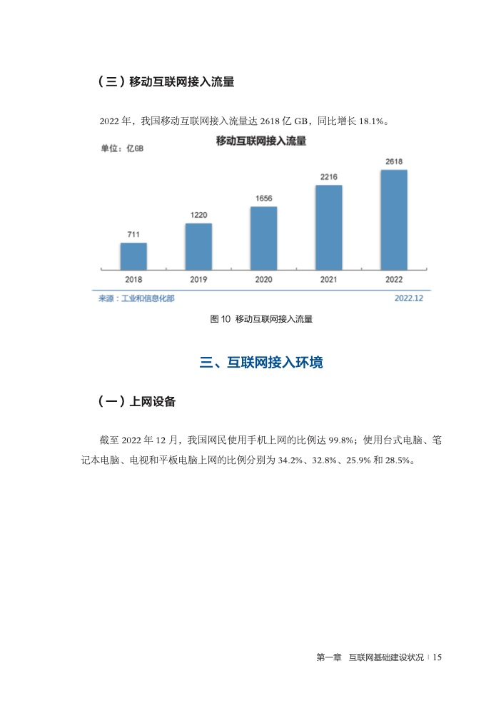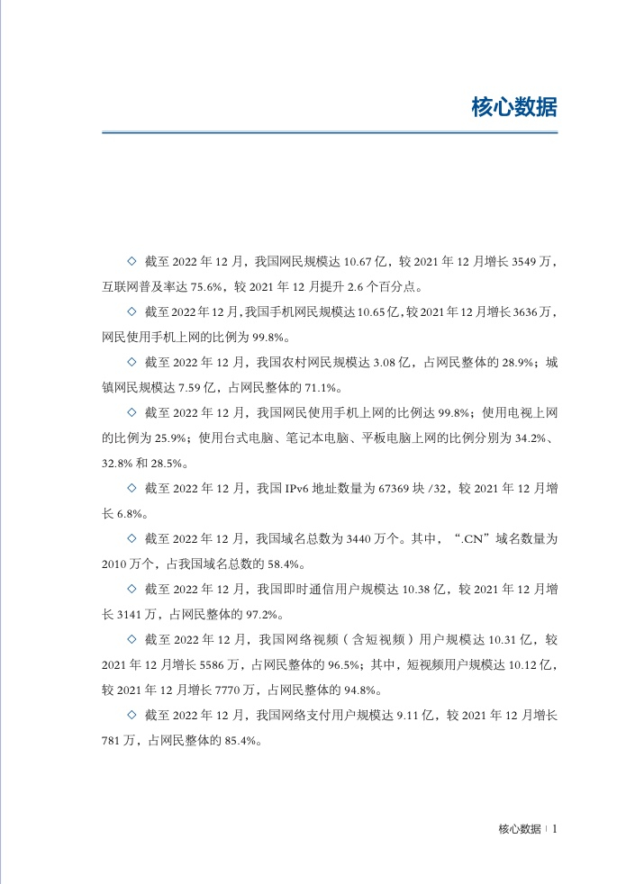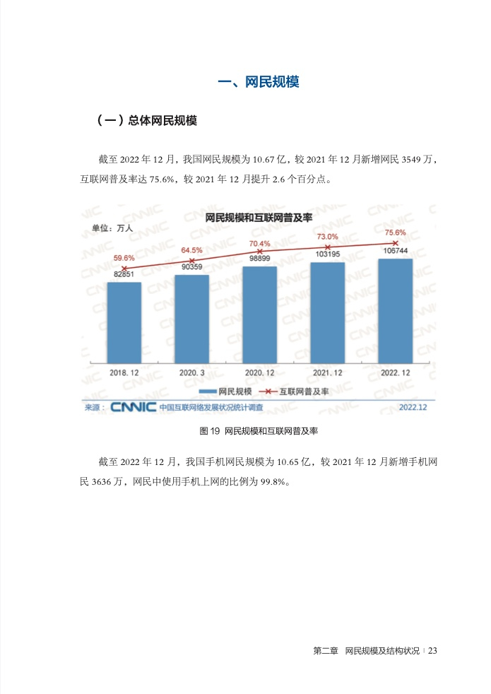截至 2022 年 12 月,我国网民规模为 10.67 亿,同比增加 3.4%,互联网普及率达 75.6%。其中,城镇网民规模为 7.59 亿,农村网民规模为 3.08 亿,50 岁及以上网民群体占比提升至 30.8%;全年移动互联网接入流量达 2618 亿 GB。