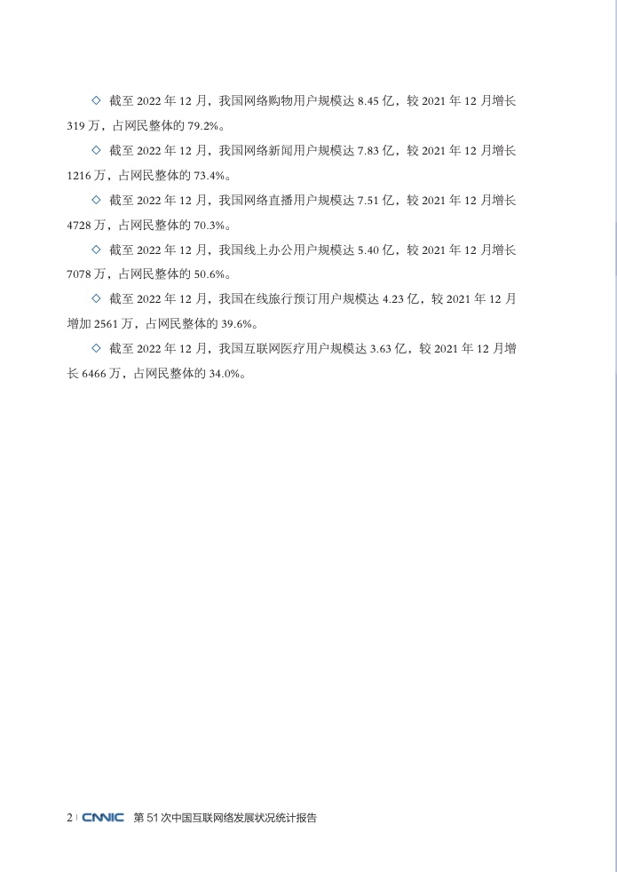 2022 年,我国线下场景加快拓展,促进相关线上业务进一步发展,形成线下线上互促共融的良好态势。其中,在线旅行预订、线上健身等领域持续发展,为广大网民创造更加丰富多彩的数字生活。截至 2022 年 12 月,我国在线旅行预订用户规模达 4.23 亿,占网民整体的 39.6%;线上健身用户规模达 3.80 亿,占网民整体的 35.6%。