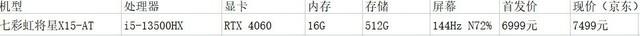七彩虹将星X15-AT搭载了i5-13500HX处理器,和RTX4060独立显卡。有15.6英寸屏幕,144Hz刷新率,支持独显直连。首发6999元,现价7488元,性价比还是很高的。如果想要性价比高一些,也可以考虑这款。