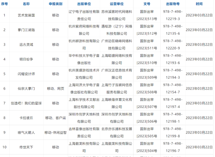 据国家新闻出版署页面显示,2023年3月份国产网络游戏审批信息公开。