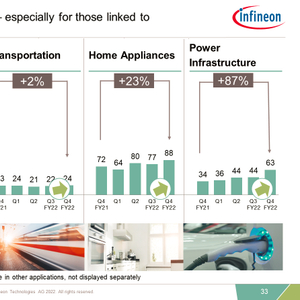 基于对英飞凌2021 和2022 财年每季度营收对比来看,自动化和驱动、家电以及电动汽车这三个领域是电机控制系统应用的主要市场增长点。这3 大电机驱动的支柱可以很好地反映全球电机驱动的发展。根据市场咨询公司分析师的观点以及客户对市场的看法,认为电机驱动在2023 年的增长相对平稳。