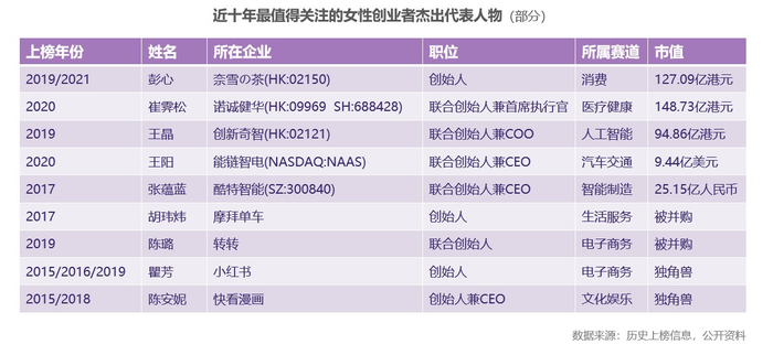 她们中有上市公司诺诚健华创始人崔霁松、五谷磨房创始人桂常青等,以及多位独角兽企业创始人,例如小红书创始人瞿芳、数坤科技联合创始人马春娥、福佑卡车创始人兼CEO单丹丹、快看漫画创始人陈安妮等。