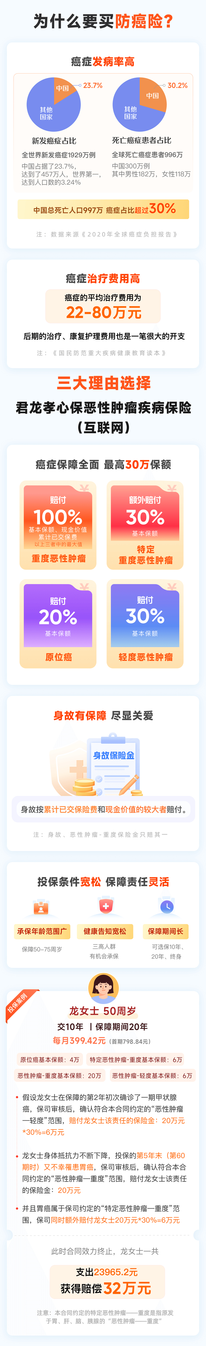 50周岁至75周岁的中老年人均可投保,3种保险期间可选:10年、20年,最长可保障至终身。最高可享30万保额,并提供身故保障,保障期间一旦不幸身故,可赔付累交保费与现价二者之间的较大者。