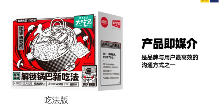 大吃兄这个品牌就是伴随着第一盒锅巴诞生的——在今天看,大吃兄开创了线上锅巴的品类,开创了锅巴的品牌时代。