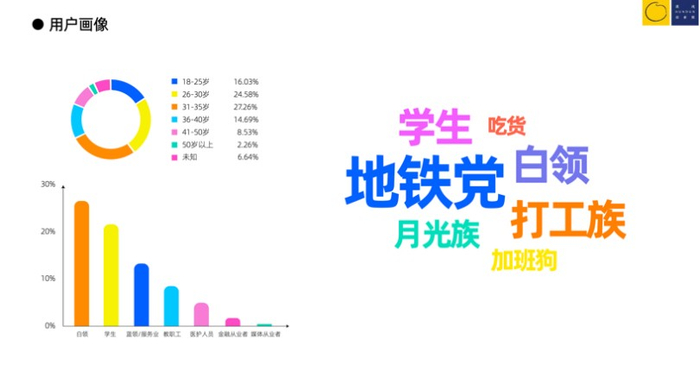 再拆下我们用户的颗粒度,几个比较集中的标签是地铁、打工族、月光族等等。所以从统计结果上来看我们的用户,相对都年轻化一些。