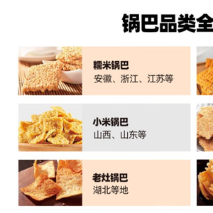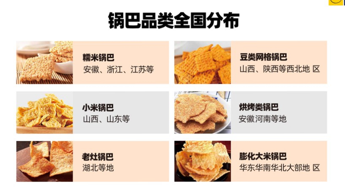 第一,从锅巴的市场体系来看,全国的锅巴市场分布是华东地区的糯米锅巴、华南华北地区的大米膨化锅巴、山西山东的小米锅巴、西北地区的豆类网格锅巴,还有湖北地区的老灶锅巴等等。锅巴这个品类的地域特征相当明显,但同时很清晰的就是锅巴这个品类还没有形成统一的认知。
