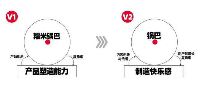 从单点上来看,V1是糯米锅巴,V2 就是锅巴。很清楚V2阶段的“一”是制造快乐感这件事情,打透锅巴,打透制造快乐感。内容属于迭代,持续做迭代的内容,制造快乐的内容反馈用户,从而增长复购率。