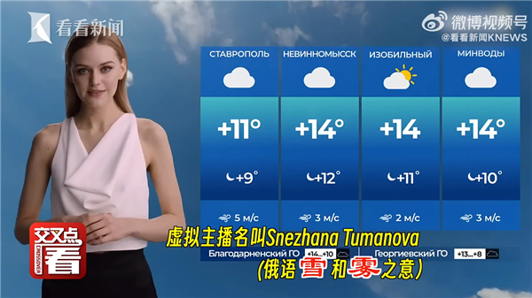 据看看新闻KNEWS报道,俄罗斯南部斯塔夫罗波尔地区的一家电视台推出了一位AI天气预报女播报员,她亮相2次后就圈粉无数。