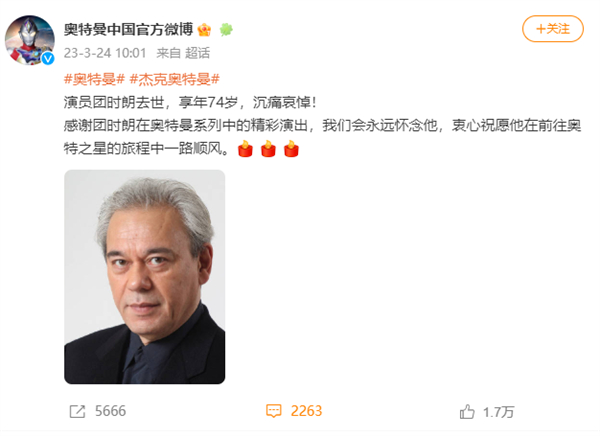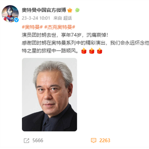 团时朗去世的消息引起网络关注,相关话题登上微博热搜,奥特曼中国官方微博也发文悼念,“感谢团时朗在奥特曼系列中的精彩演出,我们会永远怀念他,衷心祝愿他在前往奥特之星的旅程中一路顺风。”
