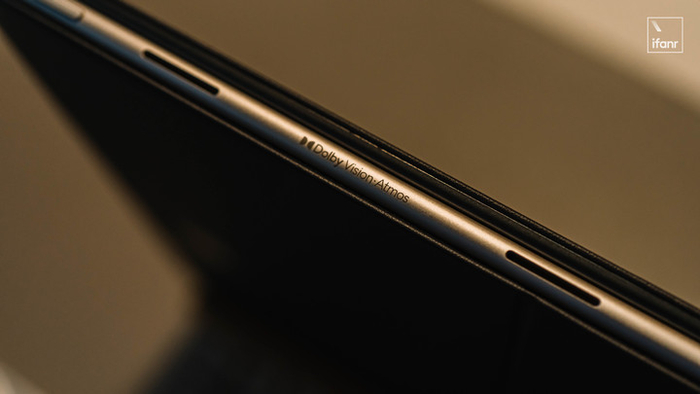 中框左右共有四个扬声器开孔,搭配着杜比全景声认证,观影很是带劲,但得在距离平板半米以上时,才有环绕立体的效果。