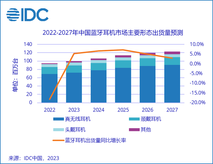 IDC 表示,2023 年蓝牙耳机市场预计小幅回升 5%,随着渗透率不断提升,市场逐渐呈现饱和状态,在技术功能尚未出现明显革新的情况下,难以呈现大幅增长,而是逐渐开启结构性调整,延长发展周期。