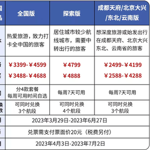 南航官方微信显示,“畅游中国”3月21日正式发售,主要卖点为无限飞行(境内航线畅飞)、不限年龄、套餐任选,系列产品涵盖全国版(4日款、4+1款、4+2款、一周7日畅行款)、探索版、地区版(成都天府版、北京大兴版、东北版、云南版),不同产品在出行时间、可同时兑换最大航段数等方面存在差异,售价在2499元至4888元不等。
