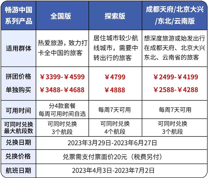 “畅游中国”系列产品对比,财联社记者截自南航官方微信