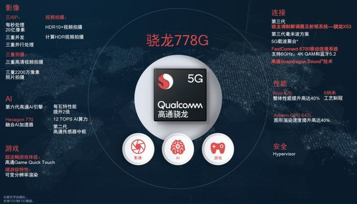 作为骁龙 780G 的衍生版,骁龙 778G 最大的改变就是放弃三星,选用了台积电的 6nm 工艺,比自家的 7nm 制程功耗降低 8%,理论上不会逊色三星 5nm 太多,联发科最新的天玑 900 和天玑 1100)天玑 1200 也采用了这套工艺。骁龙 778G 改用台积电制程,要么是三星 5nm 产能不够,要么就是高通觉得这个工艺做中端芯片不经济。