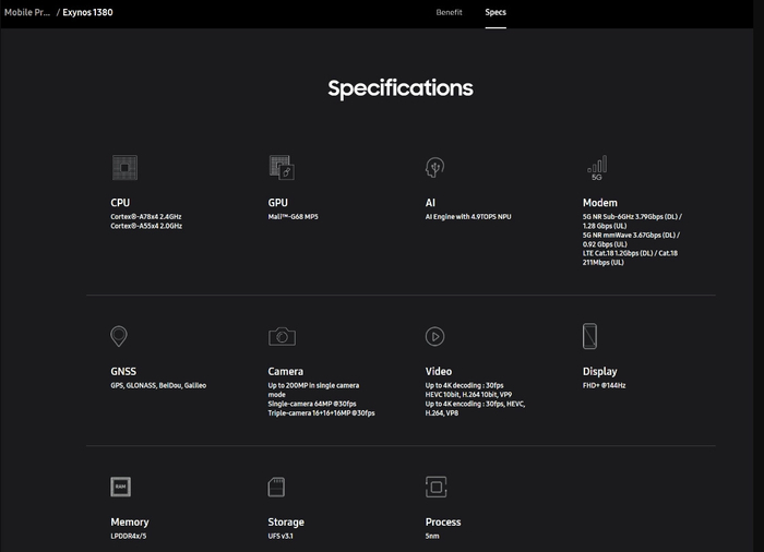 Exynos 1380 采用 5 纳米工艺,有四个 ARM Cortex-A78 CPU 核心,频率为 2.4GHz,四个 ARM Cortex-A55 CPU 核心,频率为 2GHz,辅以 Mali-G68 MP5 GPU,频率为 950MHz,支持 144Hz 刷新率的 FHD + 显示屏,支持 LPDDR4x 和 LPDDR5 DRAM 芯片和 UFS 3.1 存储。