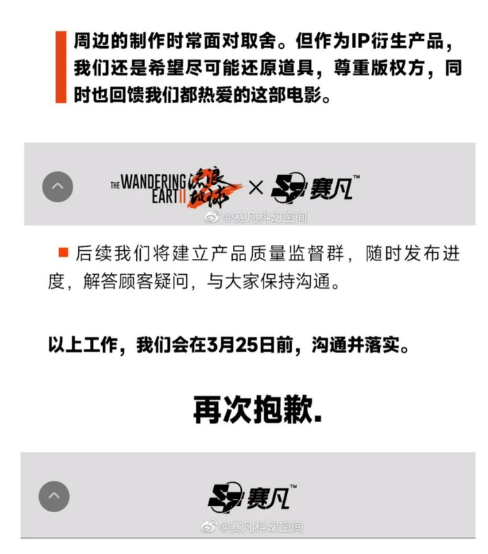 愤怒的粉丝纷纷在微博、淘宝等平台“前排怒骂”,还相约去工商、质检部门投诉赛凡,风声之大,逼得《流浪地球》系列导演郭帆亲自下场“灭火”,敦促赛凡端正态度,好好整改。