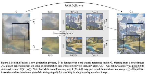 简单来说,MultiDiffusion的关键在于,在预先训练好的扩散模型上定义一个全新的生成过程。从噪声图像开始,在每个生成步骤中,解决一个优化任务。