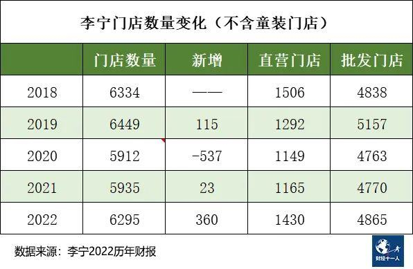 尽管销售遇阻,李宁仍然按照原先计划进入大规模开店的模式。2022年新增门店360家,比安踏主品牌多160家,其中超过七成 (265家) 为直营门店。在所有新增门店中,逾半数 (195家) 是四季度刚刚开张的。