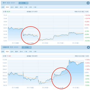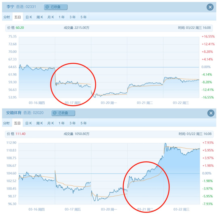 (安踏集团和李宁3月17日至22日的5日股价走势图,圈出的位置为业绩发布当日。)
