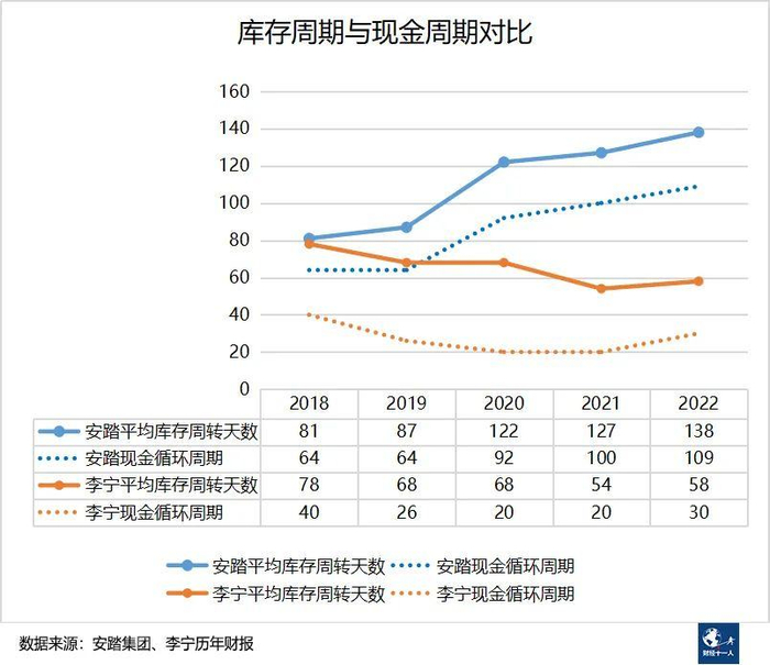 安踏集团存在已久的库存问题,在2022年又刷新了纪录:平均库存周转天数(库存周转一次所需的时间)达138天,是李宁的2.4倍;现金循环周期(企业在经营中从付出现金到收到现金所需的平均时间)为109天,是李宁的3.6倍。