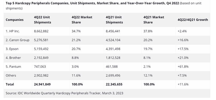 IDC:2022年Q4全球打印外设出货量达近 2500 万台 同比增长11.6%