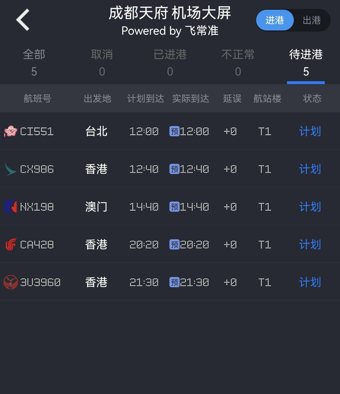 此外,在港澳台航班信息方面,明日首班入港航班,航班号为CI551,从台北桃园飞往成都天府,计划8:25起飞,中午12:00抵达成都天府;首班出港航班,航班号为CI552,从成都天府飞往台北桃园,计划13:10起飞,预计16:45抵达台北桃园。当天,港澳台航班进出港班次分别有5班,其中香港航班分别有3班。