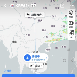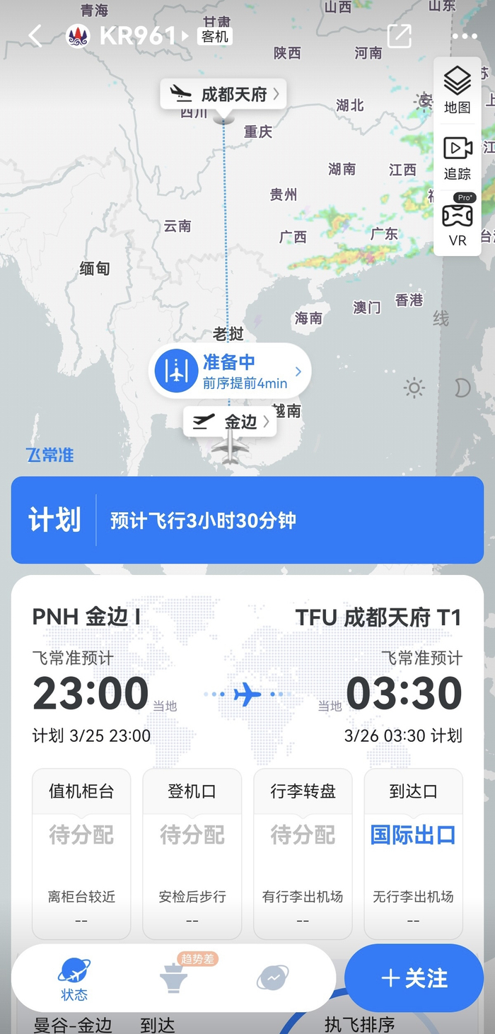 据飞常准APP数据显示,26日成都天府国际机场正式开始运营国际地区航线后,首班入境航班航班号为KR961,从金边飞往成都天府,计划到达时间为明日凌晨3:30;首班出境航班,航班号为KR962,计划明日凌晨4:30从成都天府起飞,预计当地时间7:05到达。