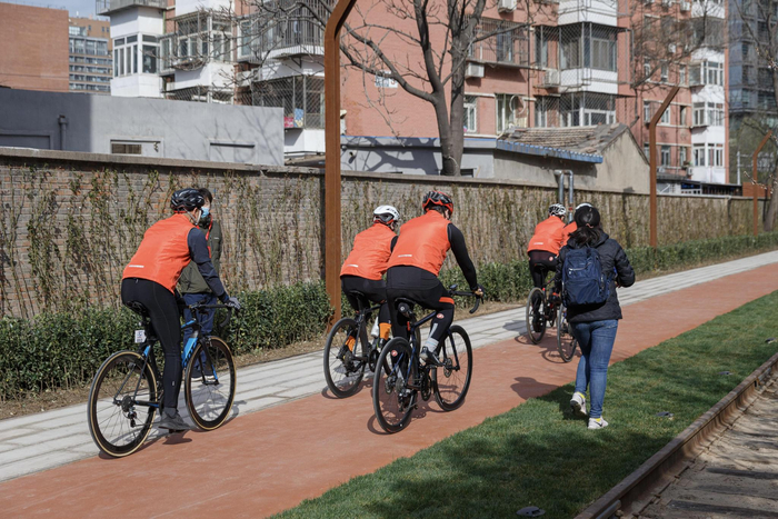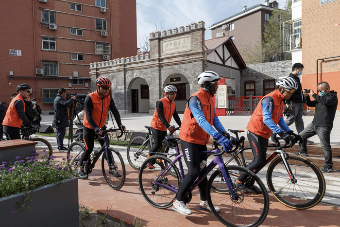 2023年3月25日,清华园车站旧址“焕颜”亮相。图为骑行队伍从这里出发,前往颐和园益寿堂和香山革命纪念地参观瞻仰,重走“赶考路”。新京报记者 郑新洽 摄