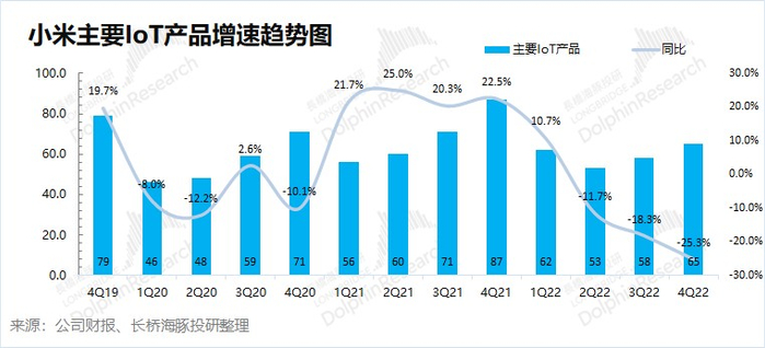 其中海外互联网收入,小米本季度仍实现了19.4%的增长。而公司本季度海外收入的两位数下滑,主要来自硬件业务。在本季度全球宏观不稳定因素的环境下,直接影响了小米的手机和IoT产品的出口。根据海豚君的测算,小米手机四季度在海外市场(除中国以外)出货量同比下滑达到22.2%,与海外市场收入下滑情况相近。进一步可以推测出四季度的海外IoT业务,下滑幅度还将大于26%。