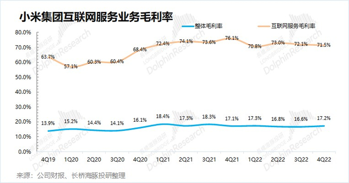 本身小米公司的互联网服务这一波毛利率的上升,主要是由较高毛利率的广告业务占比提升带来的结构性拉动。但在公司手机出货量下降以及宏观经济的影响下,影响了公司广告业务的增长,进而影响了互联网业务的毛利率。