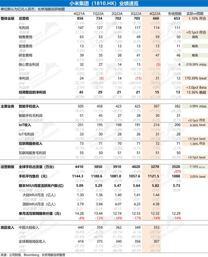 2022年第四季度经调整后的净利润15亿元,略超市场预期13亿元。从公司经营性的角度看(除投资公允价值变动以外),小米本季虽然业务上明显进入低谷期,但也基本都符合市场的预期。