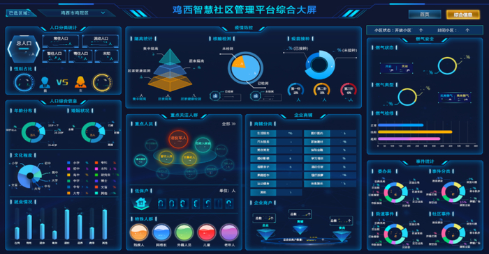 在鸡西联通智慧社区平台的后台,记者通过大屏清楚看到辖区情况全景:常住人口、流动人口情况,重点关注人群信息,疫情防控疫苗接种情况,居民反映问题及处理进度,以及事件高发地区、高发类型等。数据涵盖人员构成及分布等十几个维度信息,详实的数据、直观的图表与地理位置信息结合后的“大数据”构成了网格化基层治理的“最强大脑”。