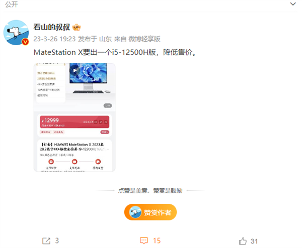 4K+生产力屏!华为MateStation X低配版来了:换装i5-12500H 价格更便宜