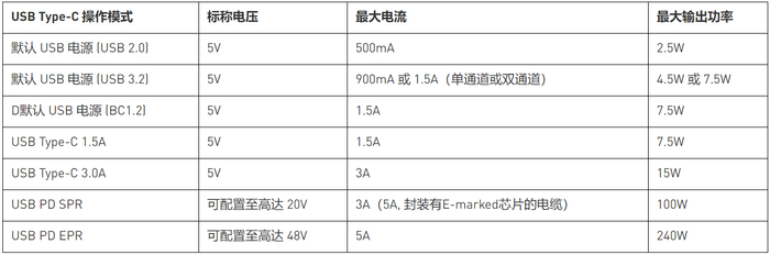 表 1 显示了USB Type-C不同操作模式下的功率级别。