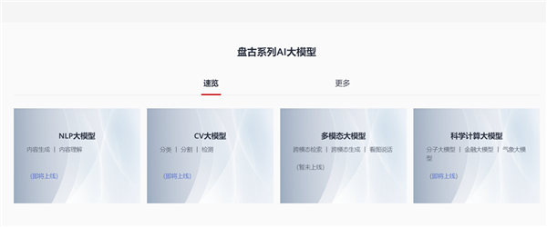 目前,盘古大模型中的NLP大模型、CV大模型以及科学计算大模型都已经被标注为即将上线状态。