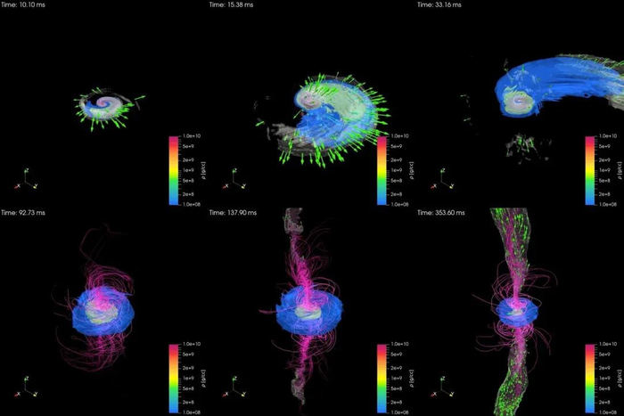 通过模拟可以看到,当合并一开始,在几毫秒内中子星就瞬间被黑洞撕碎(图中白色部分),其中 80% 的物质立马被黑洞吞噬。在随后的 10 毫秒,其余的物质形成了一个单臂的螺旋结构,部分物质被甩了出去,剩余的 0.2~0.3 个太阳质量在黑洞周围形成了一个吸积盘。随着吸积盘的物质向黑洞跌落,黑洞的两极迸发出强烈的电磁辐射和物质喷流,这将可能出现短暂的伽玛射线暴。从中子星被撕裂到黑洞将其完全吞噬,整个过程也就 1~2 秒的时间,可见黑洞不愧是真正的顶级掠食者。