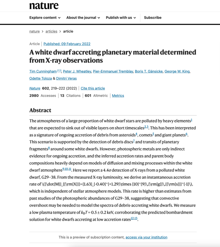 2022 年 2 月,一篇发表在《自然》上的文章中,研究人员通过钱德拉 X 射线望远镜在一颗白矮星(G29-38)的大气层中发现了重元素的污染痕迹。